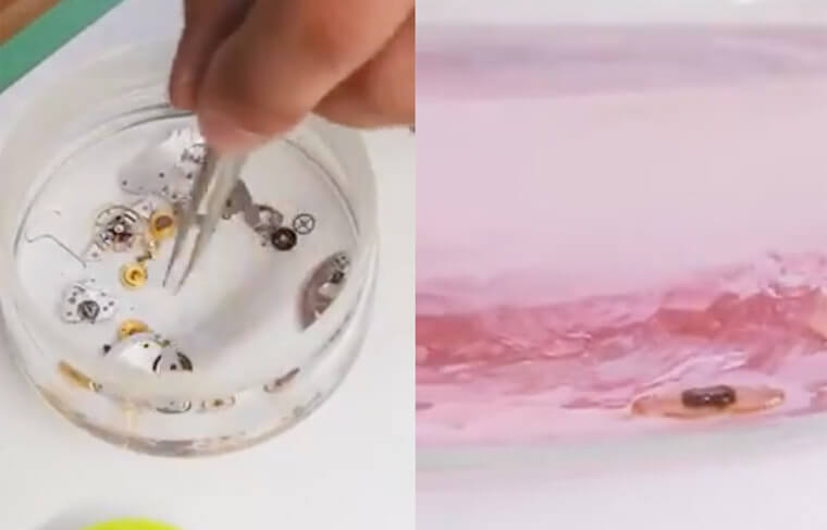 ▲接著開始清除機芯零件的污垢、並把機芯零件一一拆下。