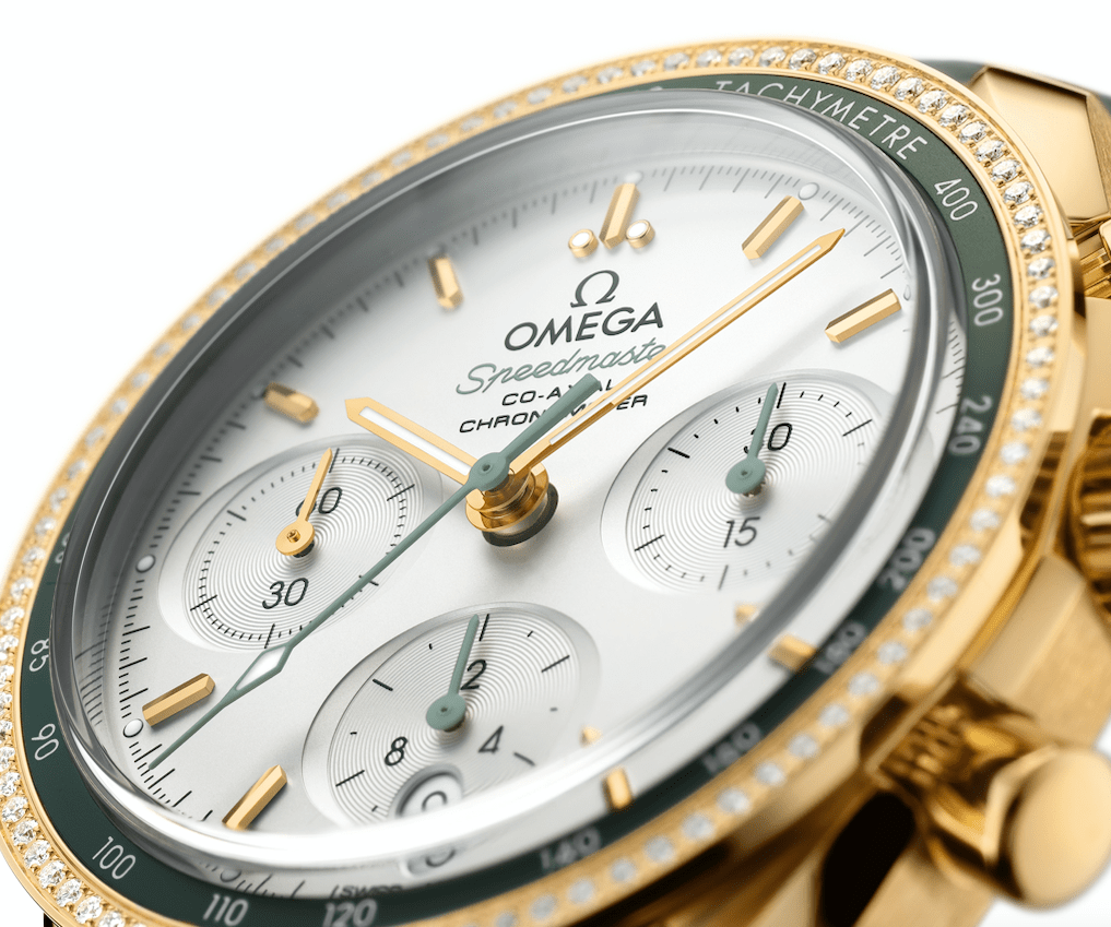 第二款新錶採用閃耀動人的18K黃金材質、銀色蛋白石面盤與綠色皮革錶帶。指針混合18K黃金與綠色清漆,而箭頭形刻度則為18K黃金。除了底蓋具備歐米茄獨一無二的海馬徽章壓紋,這些金質手錶還由歐米茄3330同軸擒縱機芯負責驅動,且歐米茄提供整整五年的保固。