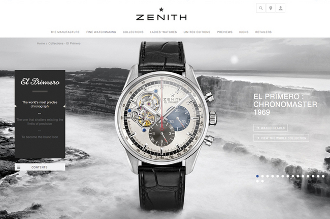 瑞士製錶品牌ZENITH以正統,無畏及愉悅定義品牌價值,不僅寓意卓越工藝,更蘊藏著對於自由及夢想的大膽追求。2013年,ZENITH開啟一場全球性的品牌行銷活動,以全新網站及廣告形象引領大家進入自由的世界,氣勢恢弘的自然景色結合機械美學,以此向ZENITH大膽革新的勇氣以及其追求卓越的理念致敬。