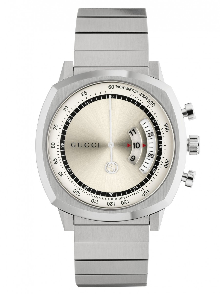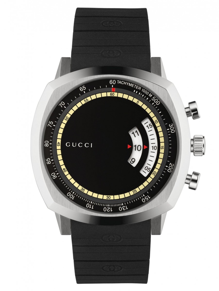 除米奇版腕錶之外,Grip系列還帶來更具實用性的計時碼錶Grip Chrono,可實現時長一分鐘的計時,在外觀上也較經典款式更具陽剛大氣風範。 Grip Chrono系列腕錶均採用直徑40毫米的錶殼,面盤上設置兩個窗口,分別顯示小時和分鐘。其中一款採用不鏽鋼材質的錶殼和錶鍊,由互扣式雙G造型的指針擔當計時功能,具備功能性的同時亦能凸顯品牌特質;另一款則採用不鏽鋼錶殼和黑色橡膠表帶,錶帶上飾有雙G圖案,計時功能由環繞面盤周圍運行的紅點指針負責。