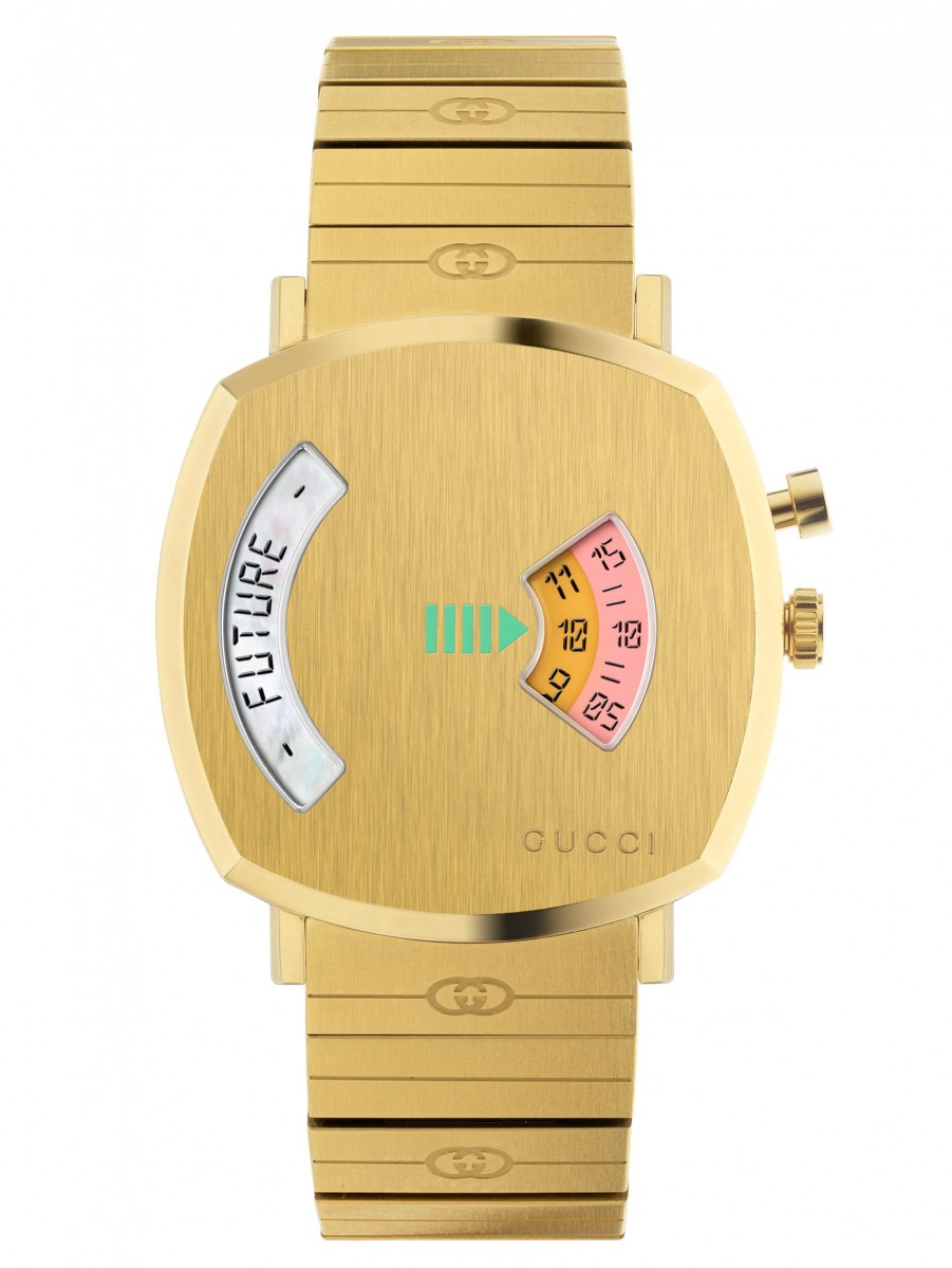 為迎接中國農曆鼠年,Gucci推出在面盤上飾有米奇圖案的Grip系列腕錶,由於採用了夜光材質,米奇的眼睛在黑暗中也清晰可見,細節之處體現Gucci的精湛工藝和用心設計。其中直徑為35毫米的錶款採用黃金色PVD鍍層錶殼和GG Supreme高級人造帆布錶帶;而直徑為38毫米的錶款則採用不鏽鋼錶殼和錶鍊,錶鍊上鐫刻互扣式雙G元素。兩個錶款均承襲了Grip系列的標誌性外觀:面盤上設有兩個窗口,分別顯示小時和分鐘。