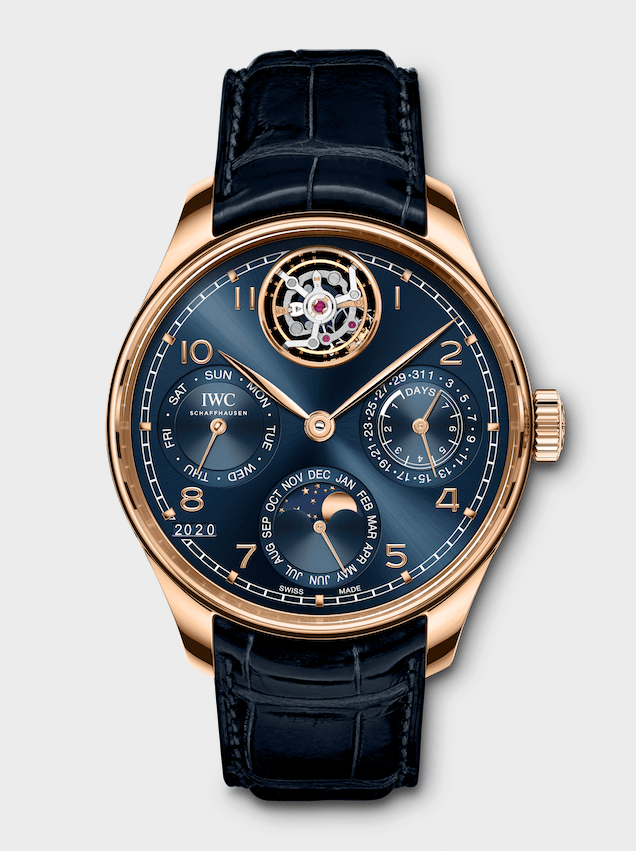 陀飛輪是製錶領域最令人讚嘆的成就之一。陀飛輪內設有 擺輪在框架中繞軸旋轉,這不但在錶盤上呈現無與倫比的 視覺享受,不斷旋轉的擺輪也能減少地心吸力對振盪系統 的影響,增加腕錶的精準度。而今年,IWC就推出兩款葡萄牙系列萬年曆陀飛輪腕錶。兩種款式分別限量50枚。