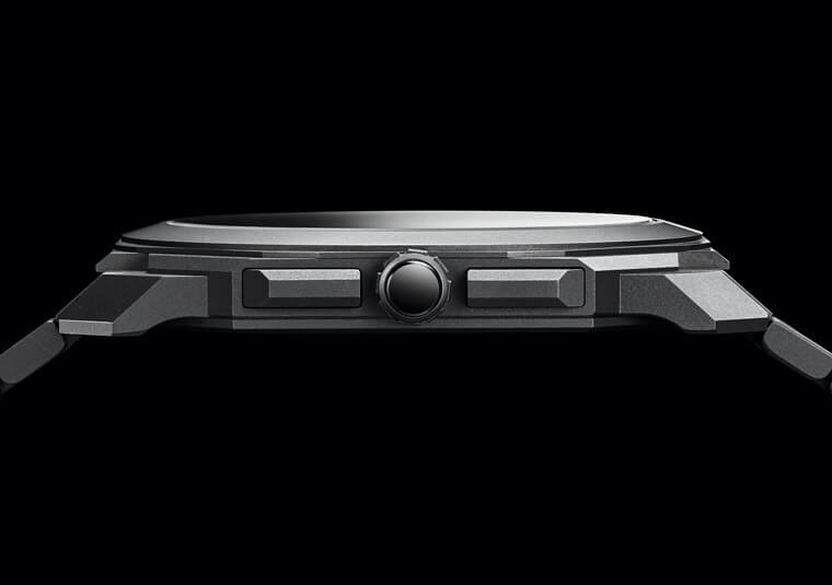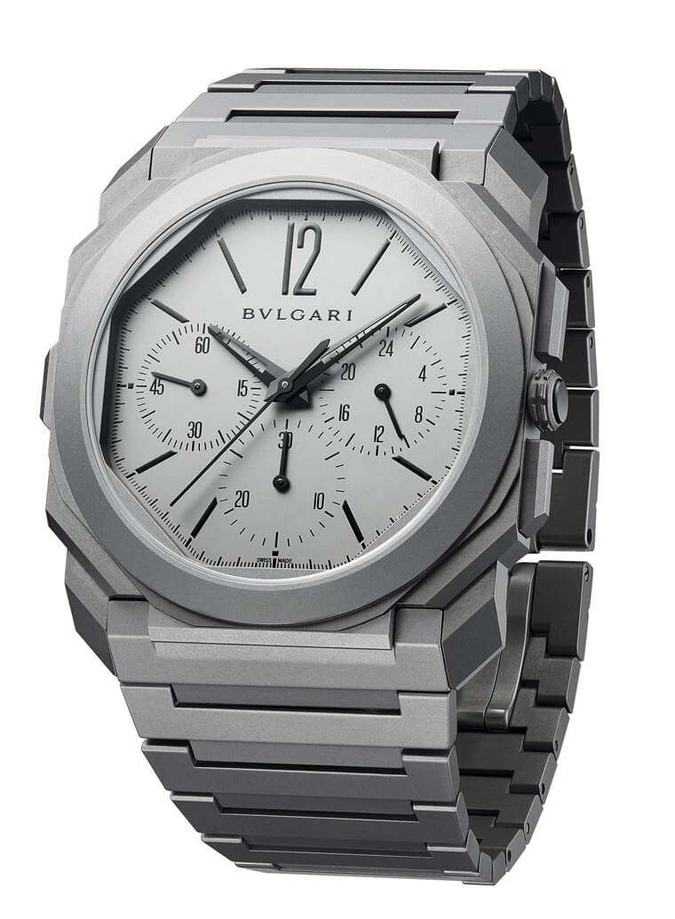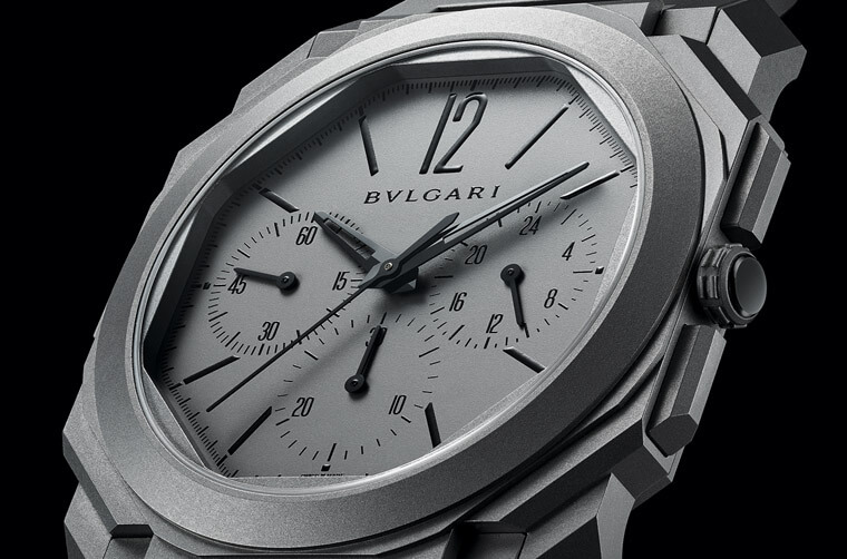 Octo Finissimo Chronograph GMT採用寶格麗近年常應用於Octo Finissimo系列的噴砂鈦金屬錶殼,鈦金屬兼具強度以及相對輕盈的重量是創作超薄錶的理想材質,品牌甚至連面盤也同樣以噴砂鈦金屬製成,使其外觀維持著高度的一致性,此外錶款錶冠頂部特別鑲上黑色陶瓷材質,讓腕錶看起來層次更豐富,同時陶瓷耐磨耐刮以及不會褪色的特點,也能替腕錶側面視角增添恆久的亮點。相較於其他超薄錶,寶格麗Octo Finissimo系列更常使用金屬鍊帶這點也使腕錶更具特色也更耐用甚至更舒適,Octo Finissimo Chronograph GMT相對纖薄的鈦金屬鍊帶在佩戴時完全沒有一般鍊帶錶的沉重感,長時間戴在手上也很輕鬆自在。