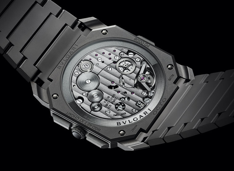 Octo Finissimo Chronograph GMT搭載的BVL 318機芯大致而言有幾個有助於降低厚度的關鍵設計,包括採用環形自動盤使其不會額外在機芯背面再佔據一定的垂直空間,另外寶格麗也透過簡化橋板分件、盡量以水平方式排列機芯零件的策略來節省空間;而在計時機制方面,品牌採用水平離合機制並將控制離合動作的搖臂做得比一般計時碼錶更扁平寬闊,既能降低厚度,又顧及機芯穩定度,從中顯示出寶格麗製作超薄錶的思維不只是為了要打破帳面上顯示的數據,品牌同時也很重視腕錶日常佩戴的實用性。