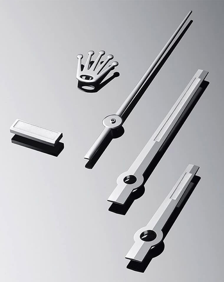 劍形時、分針搭配箭形秒針,然後時、分針的夜光塗料又只有局部塗在針上,沒錯它就是來自勞力士的天王級手錶Daytona,其實Daytona的三根針本身立體感更強烈,例如時、分針中間是有往內凹線的層次,加上秒針在尾端固定軸心的部分有特別做出一個小圓形,這個光看剪影的輪廓線並不能很清楚地呈現,但因為Daytona人氣實在太高,應該很多人看多看久之後,還是可以立馬分辨出來這是Daytona的指針。