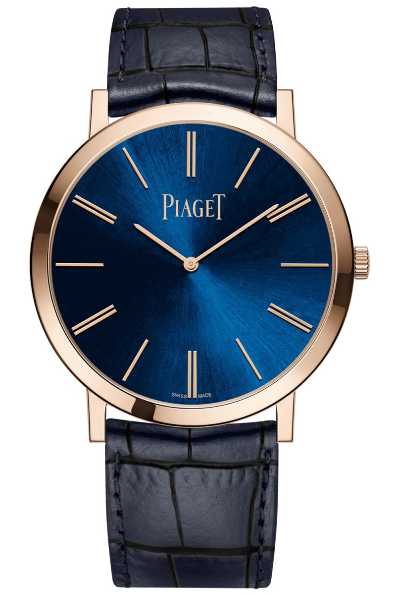 ▲Altiplano超薄系列38毫米藍盤玫瑰金腕錶採用藍色鱷魚皮錶帶,並搭配玫瑰金針扣,兩種款式各限量發行300只。