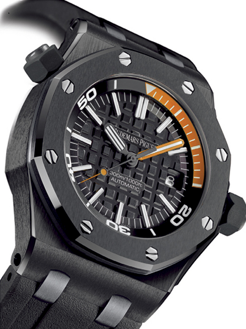 '13年愛彼推出的離岸型潛水新款,不同於過去異材質的混搭,像是鍛造碳、鈦金屬的使用,而是首次以全黑色陶瓷材質製作錶殼、錶圈與錶冠,高於不鏽鋼七倍的硬度,只有鑽石才能造成其損傷,因此要能服膺皇家橡樹離岸型八角造型嚴苛打磨與拋光處理,難度挑戰可想而知。15分鐘下潛計時圈此次以鮮豔的橘色展示,搭配內旋式錶圈視讀性同樣出色。另外,翻至錶背可見所搭載3120機芯的22K自動盤與愛彼精湛的打磨工藝,藍寶石水晶鈦金屬透明底蓋更是系列首創。