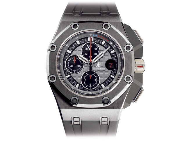 愛彼為此錶款一共推出鈦金屬、玫瑰金與鉑金三種不同材質,與錶殼一體成型的八角形錶圈,特別採用比鋼更為耐磨七倍的Cermet瓷金,原本系列中錶圈上的六角螺絲,外面以八個圓拱形螺帽固定,很有賽車的風格,搭配橡膠錶帶當中鍊節刻意模仿賽車的冷卻進氣口,錶冠部份則以微珠打磨仿擬齒輪形狀。飾以系列著名的"Mega Tapisserie"超大型格紋的黑灰色面盤,最外一圈是測速計,在12至1點的位置多了兩顆藍星與五顆紅星,是愛彼為了向車神過去七次年度冠軍致意,藍星代表1994年至1995年於班尼頓車隊時期,至於紅星則是代表法拉利車隊於2000年到2004年連續五年稱霸。