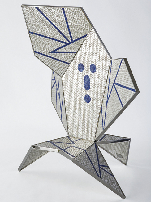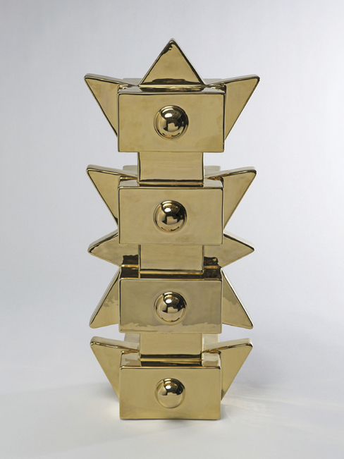 光滑的陶瓷外型鍍上了一層金屬,一樣具有柱狀的特質,但接近原始民族的圖騰元素在這件作品裡展露無遺,更增添了一層神祕的氣息。