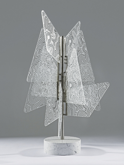 由12片玻璃、金屬支架與大理石基座所完成的《No.10》,利用12面可自由變化姿態的玻璃折射出時間的多變性。