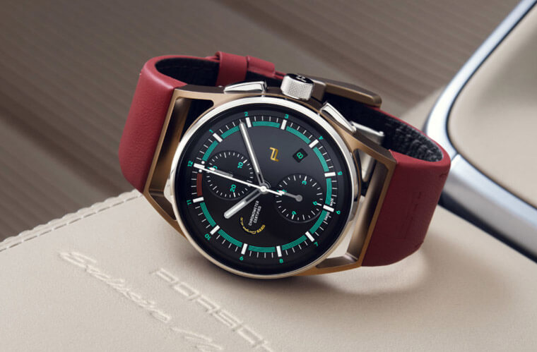911 Targa 4S Heritage Desig擁有金屬櫻桃紅和其他四種塗裝可選,車款的內裝也有Bordeaux紅或黑色搭配Atacama米色皮革,此外座椅和車門內側飾板則是仿效PORSCHE 356,以燈心絨布包覆表面,同時儀表台上的顯示系統包括轉速表和跑車計時套件則是使用綠色,之所以提到車款這些色彩元素是因為在手錶外觀上恰好能夠呼應這樣的視覺印象,例如錶帶是紅色、錶殼的金色鏤空錶耳也能呼應車身上的金色盾徽,再來面盤上的綠色細節不用多說,明顯就是車款轉速表的延伸。