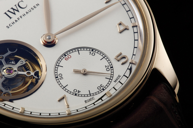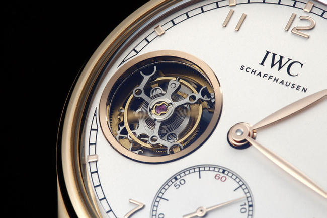 IWC的陀飛輪錶款陀飛輪上機乎都沒有小秒針,而是另外在面盤上裝秒針,這也成了他們家陀飛輪錶款的特色之一;新款的小秒盤跟主面盤同色,不過盤面上仍然有不同的裝飾。