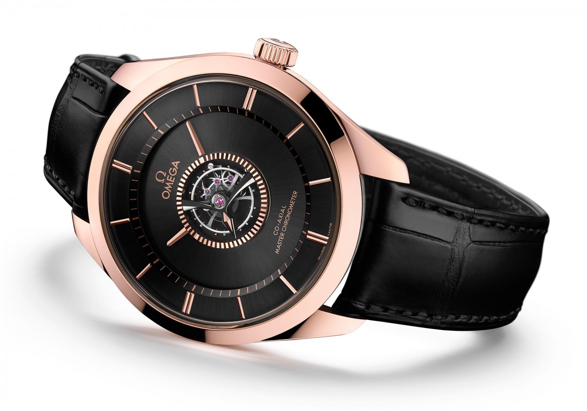 全新碟飛陀飛輪的設計出眾,整合了歐米茄的製錶專業與先進材質,包括兩種著名的歐米茄貴重合金。在黑色皮革錶帶上,43毫米錶身、錶扣商標與錶冠商標皆採18K Canopus™金——這種獨家白金合金與眾不同之處在於更加光亮、潔白與耐久。而此錶的錶耳、錶圈與底蓋則是以歐米茄旗下鮮明玫瑰金合金18K Sedna™金打造而成。在面盤中央令人絕對不會錯過的是略微傾斜、經手工拋光的黑色陶瓷鈦金屬陀飛輪框架。這個巧妙裝置驅動獨特與神祕的指針,賦予這款手錶無與倫比的歐米茄風格。