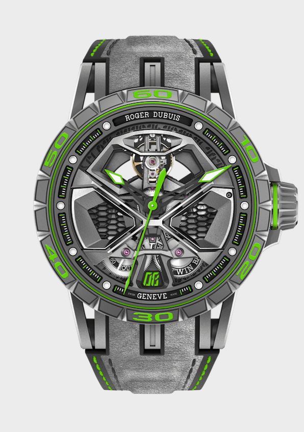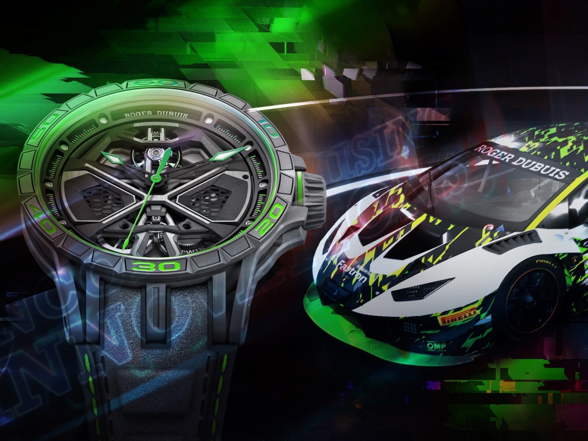 羅杰杜彼也同步推出全新配色的Excalibur Huracán Performante限量錶,其設計靈感來源於在The Real Race賽事中大顯身手的Huracán跑車。此錶款融合各項強烈鮮明的超級跑車設計元素,從獨特灰色科技鈦金屬材質、碳原子般的俐落六角形結構、象徵引擎室拉桿的X型線體設計、貌似輪胎螺帽的立體錶冠、隱密的日期顯示與十二點鐘方位如儀表板轉速表的傾置擺輪到超跑輪框造型自動盤等,無不展現超跑不息的激情狂熱。
