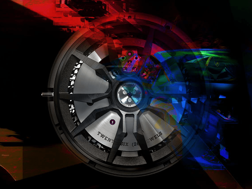 ▲Excalibur Huracán Performante鏤空自動上鍊錶背部結合輪圈設計。