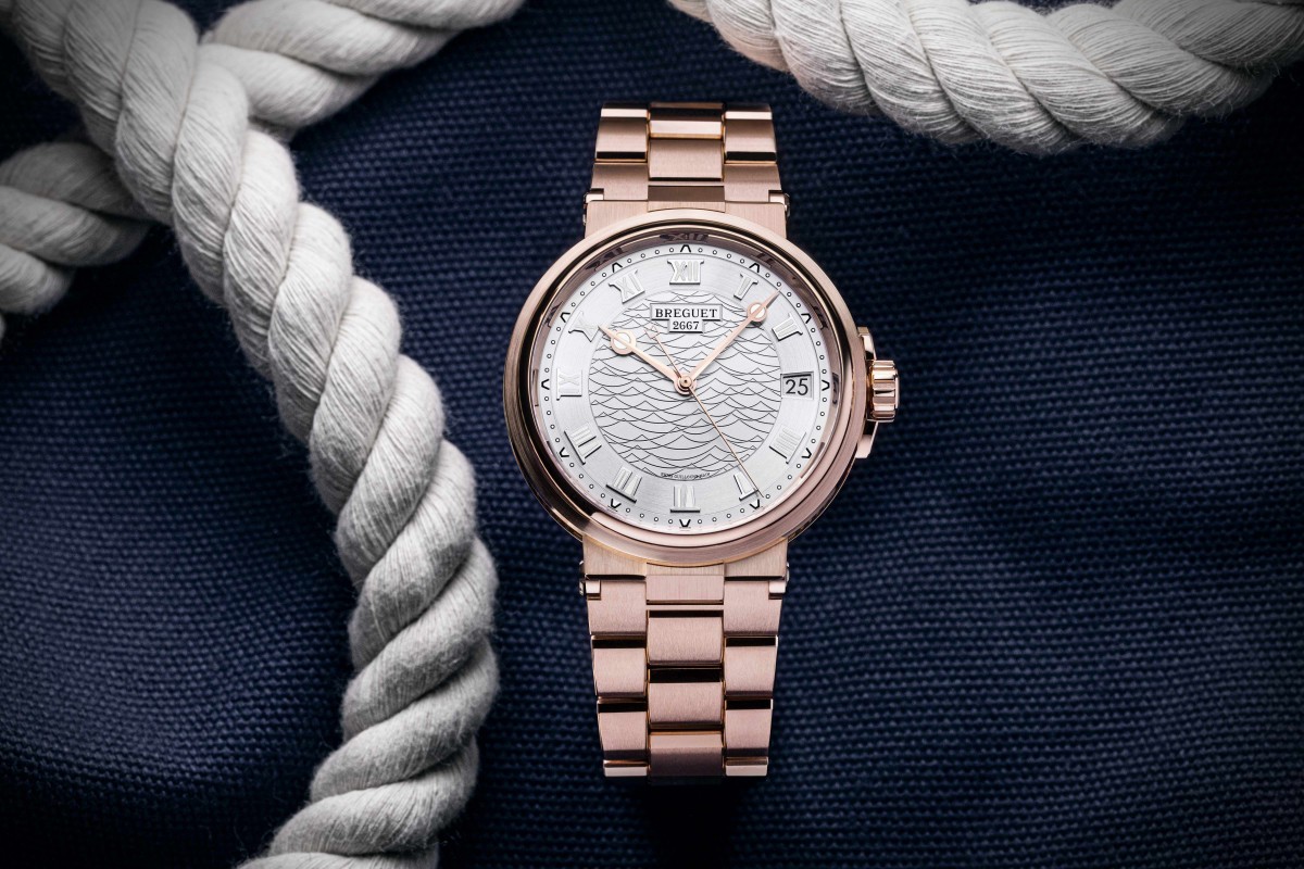 寶璣Marine航海系列體現品牌的悠久傳統,品牌先前推出過的Marine 5517大三針日期錶、Chronographe 5527計時錶,以及Alarme Musicale 5547兩地時間鬧鈴錶,到2020年發表18K白金與18K玫瑰金款式,均搭載同材質貴金屬鍊帶,展現迥異於以往的運動風格。