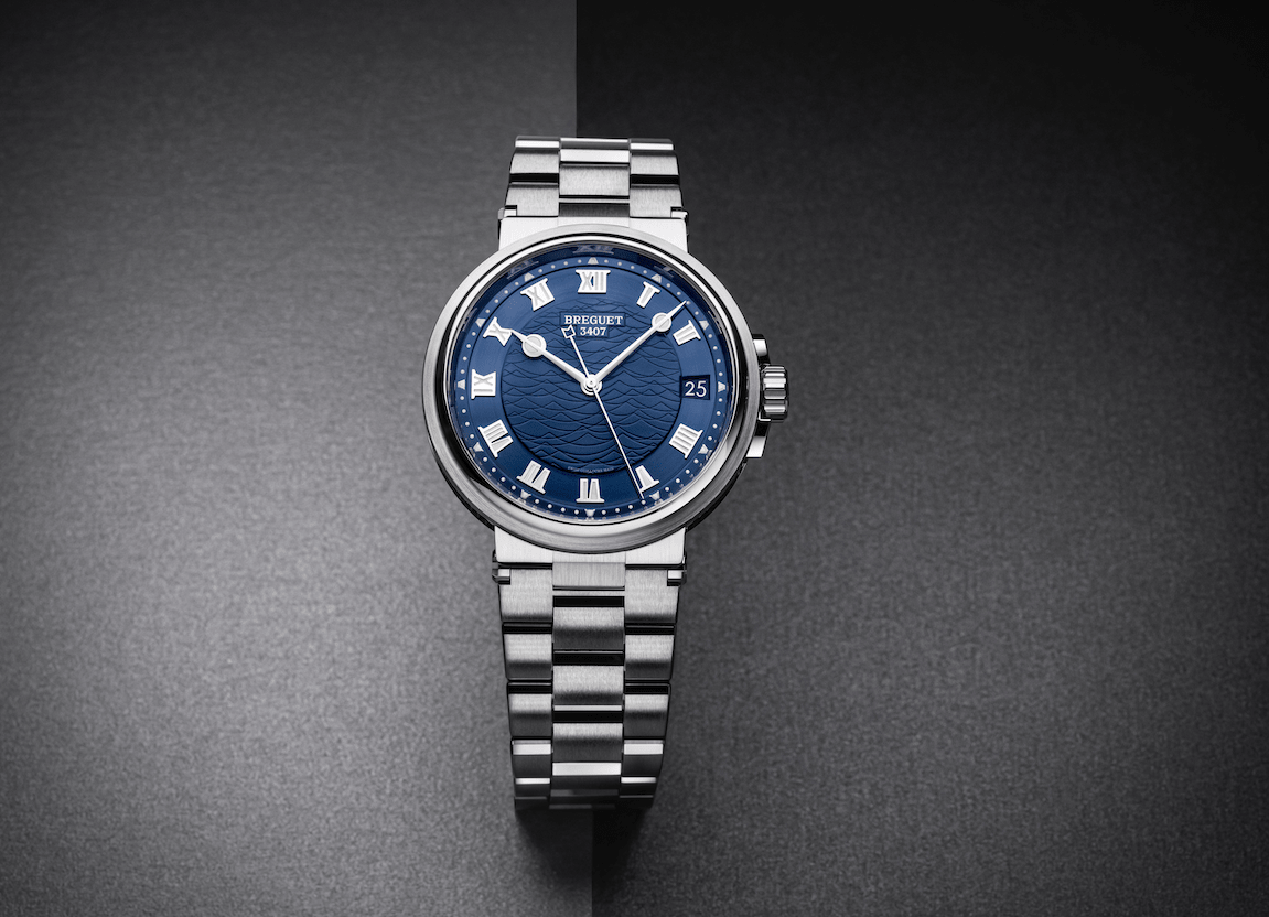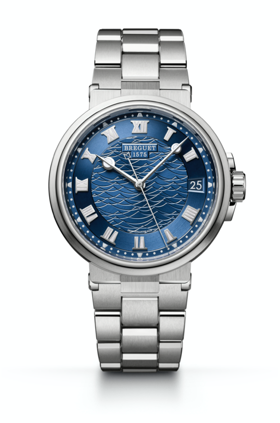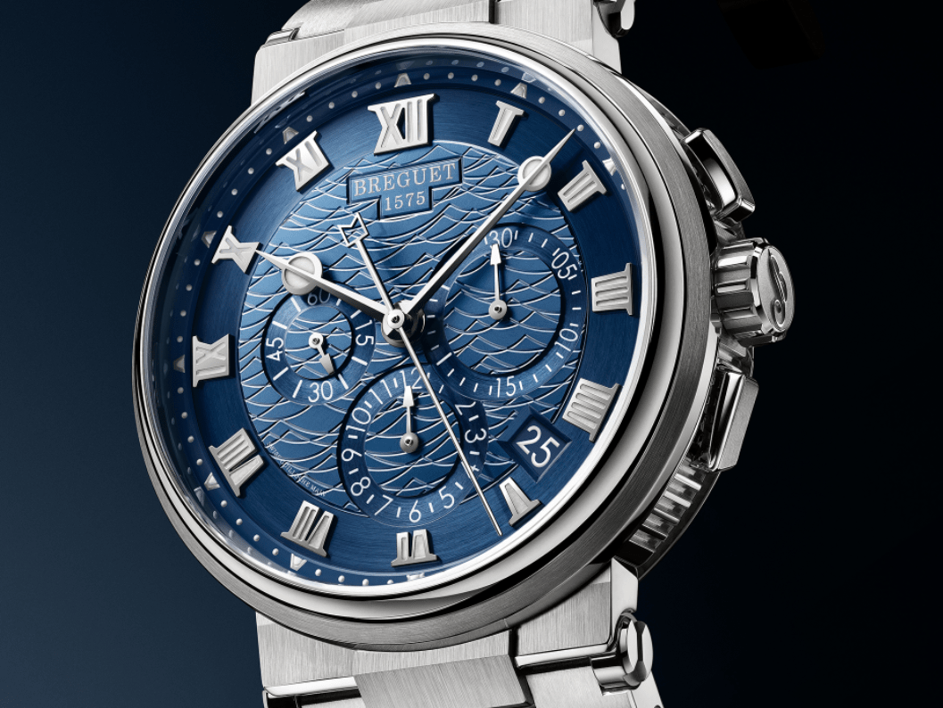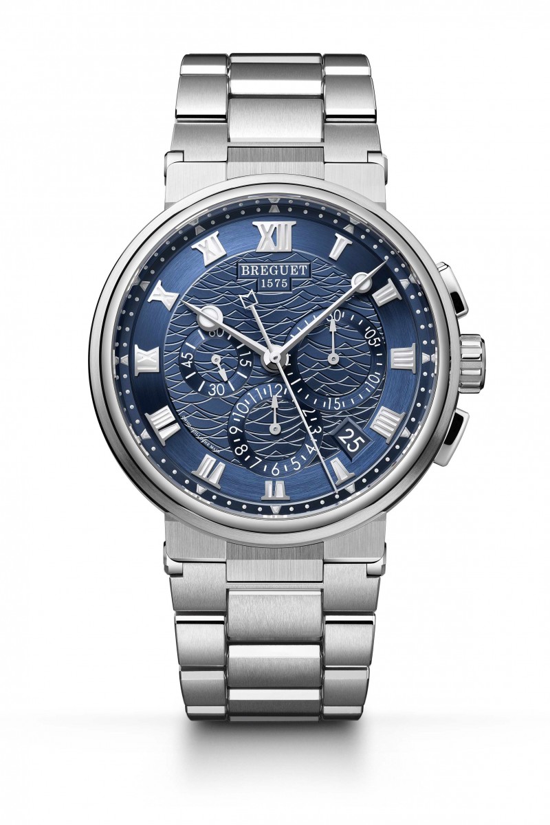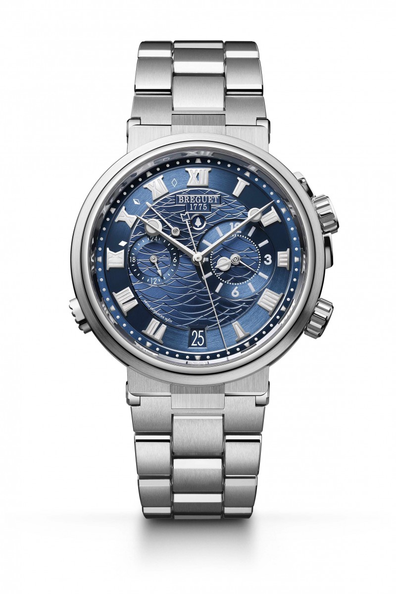 Marine 5517手錶、Marine Chronographe 5527計時錶,以及Marine Alarme Musicale 5547兩地時間鬧鈴錶的多項細節,均向海洋世界致意。機芯橋板的手工機刻雕花日內瓦波紋有如船隻的甲板;秒針的尖端呈「B」字,代錶著海事代碼「Bravo」或「Breguet」; 自動盤側採用船舵設計。