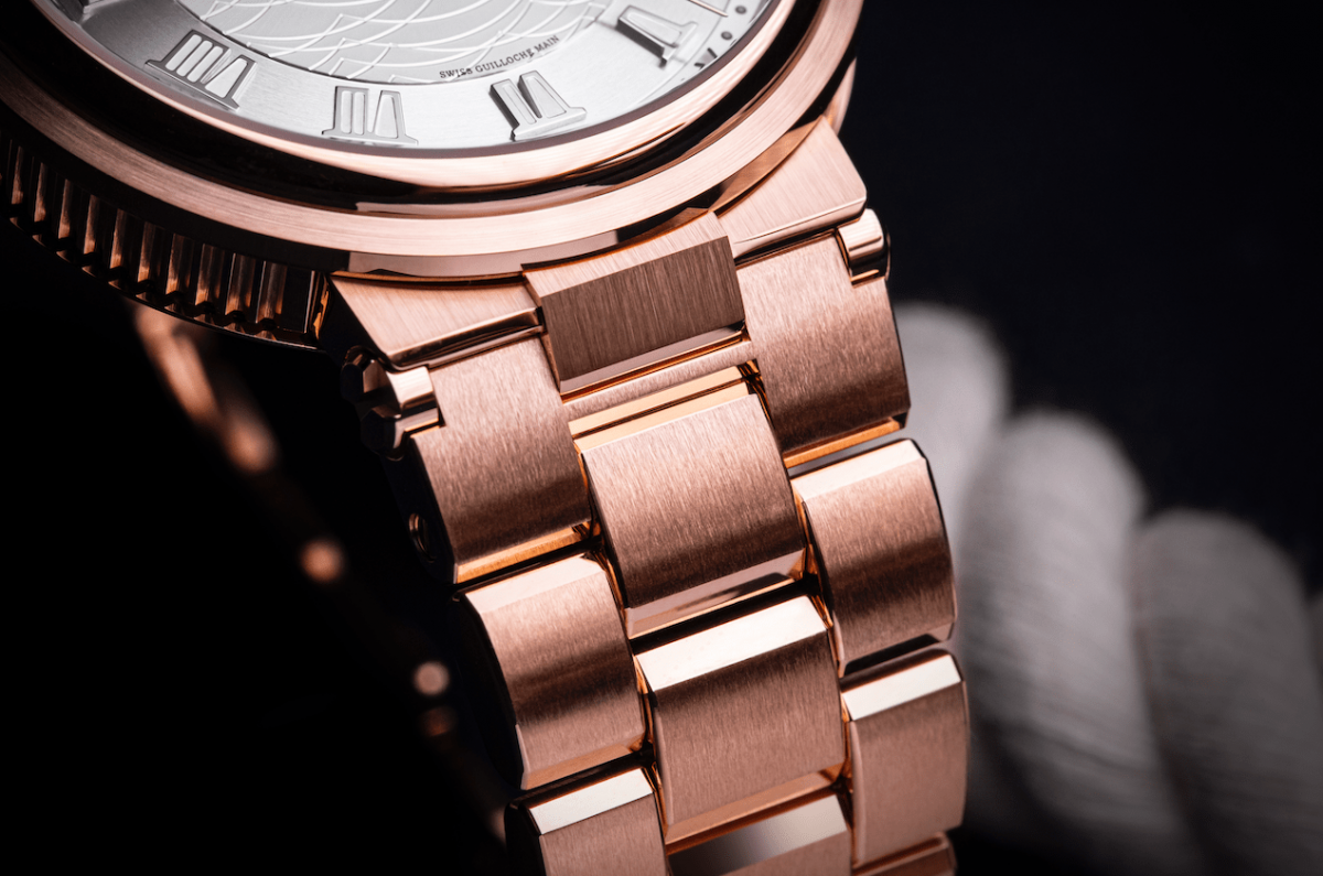 ▲金質鍊帶的霧面拋光面和亮面交替變化,與錶殼相互輝映,以最精緻及最高精密度的工藝,為手錶作最後修飾。