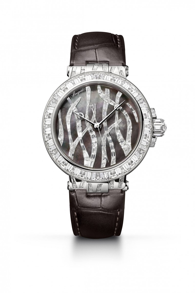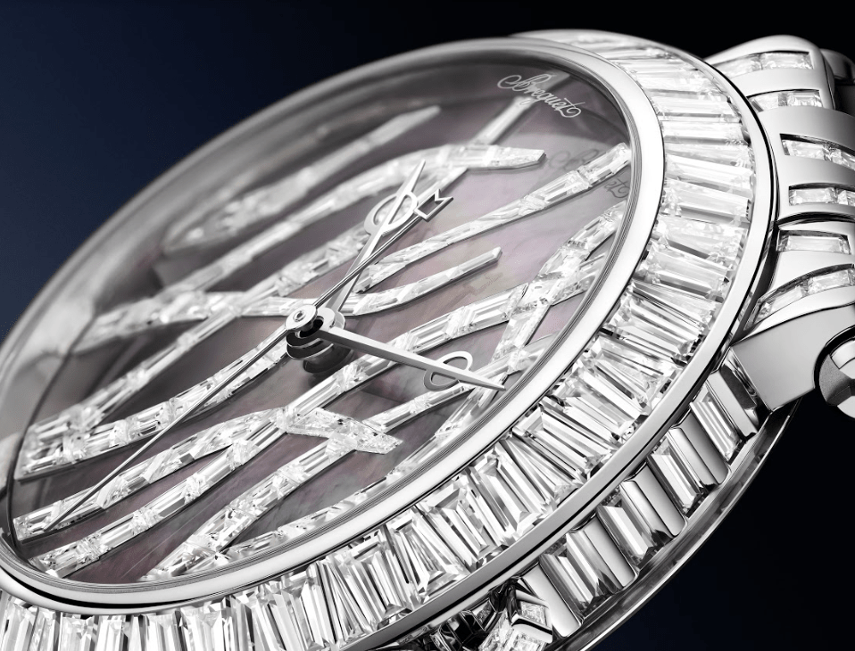 錶圈採用傳統的長方形鑽石鑲嵌設計;每小時刻度均綴以鮮明的三角形鑽石,進一步方便讀時。白金錶殼的側面和錶冠帶有精細錢幣紋,拋光白金與長方形切割鑽石互相交替。錶冠飾有 6 顆爪鑲式長方形切割鑽石,而頂部飾有 1 顆水滴形切割鑽石;錶冠護橋全鑲嵌 14 顆長方形切割鑽石。錶扣亦綴以璀璨美鑽,與鑲鑽錶圈和寶璣鏤空指針互相輝映。