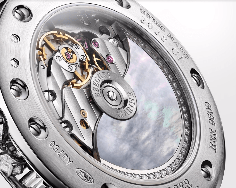 透過底蓋的透明藍寶石水晶玻璃,可欣賞591C機芯的傳統工藝,錶橋綴以手工機刻雕花Marine圖案,靈感源自船隻甲板。白金自動盤的倒角飾有閃爍的鑽石邊緣,與大溪地珍珠母貝的深邃色彩營造攝人對比。
