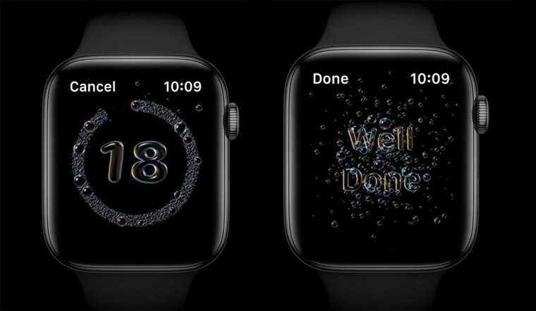 這項功能的目的是要提醒錶主洗手要洗得確實到位,主要內容就是當你啟動洗手偵側功能時,透過手錶上的傳感器感應,手錶螢幕會出現一個為期20秒的倒數計時器,你必須要洗好洗滿這20秒,洗手偵側功能才會出現”Well Done”的字樣告知錶主手部清潔已經達到效果,而如果你在20秒還沒結束前就離開水龍頭,那麼手錶會持續提醒你洗手動作尚未完成。