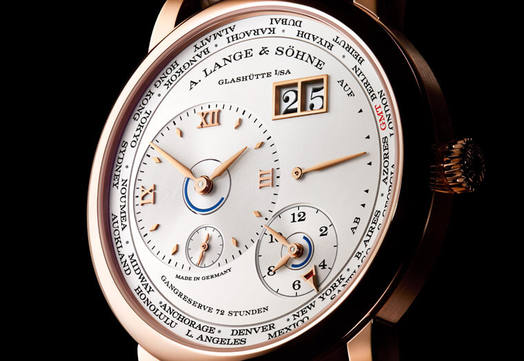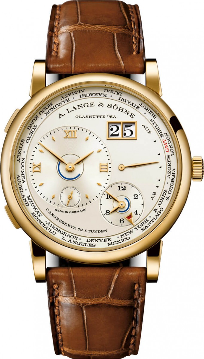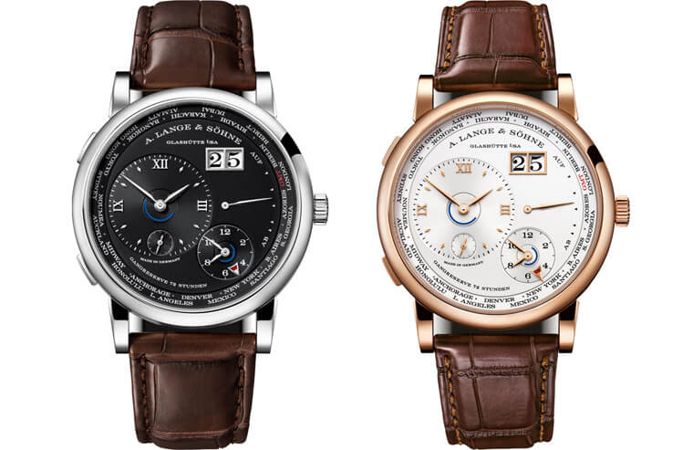 Lange 1 Time Zone首度問世以來,基本上面盤格局的變化不大,包括左半邊的偏心錶盤(指示所在地時間)、面盤右下角則有原居地時間小錶盤以此達成兩地時間辨時目的,此外手錶在右上角還有Lange 1系列招牌的大日期顯示,另外在面盤右方則有動力儲存顯示。兩地時間可透過城市圈設定。當佩戴者透過錶冠調校時間,兩個時間顯示會同時調整。