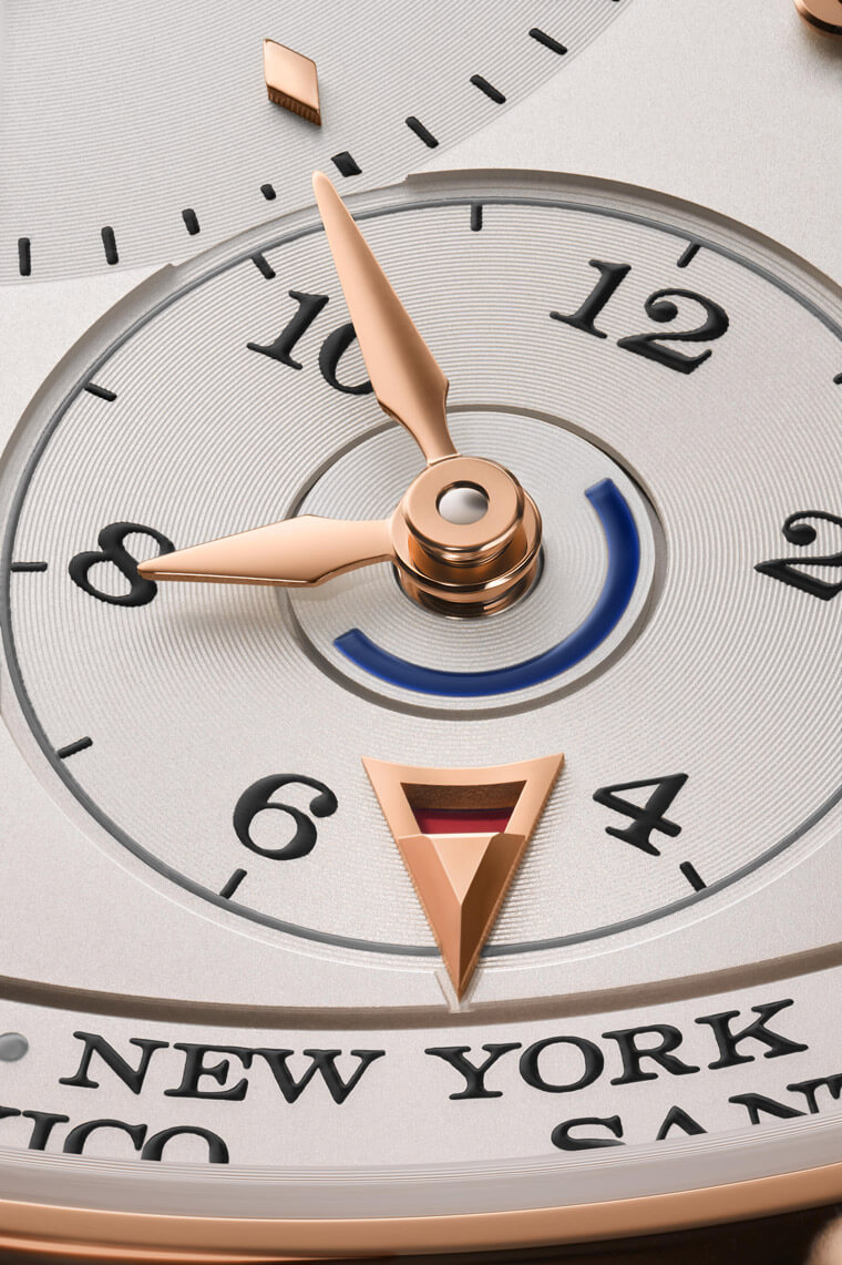 另外朗格也替Lange 1 Time Zone添加另一項方便的功能:在面盤5點位置的城市圈指標內多開了一道梯形視窗,如果視窗顯示為紅色,則代表所選城市當時正採用夏令時間,而如果所選城市全年均採用同一個標準時間,該顯示則呈淺色背景,至於該怎麼分辨該座城市是否有實施夏令時間,別擔心,這點朗格早就想好了,品牌在城市圈下方加入可分辨夏令時間的系統,所以當佩戴者在調校城市圈時,這些設定也會一併搞定。