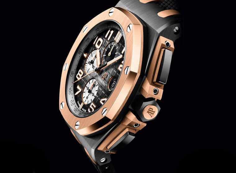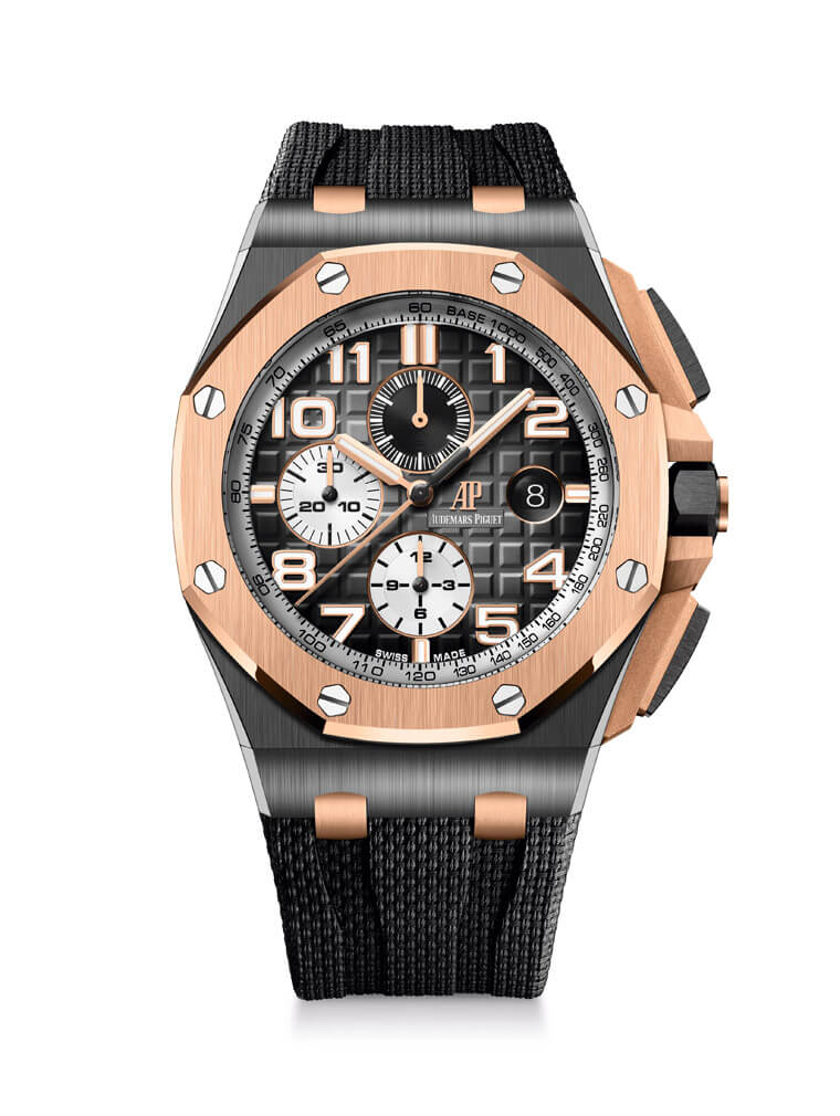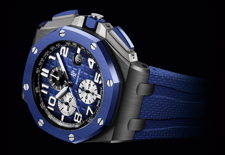 本次愛彼一口氣推出三款全新的皇家橡樹離岸型自動上鍊計時碼錶,它們的中層錶殼都是用黑色陶瓷製成,不過三款各自在錶圈、計時按把保護裝置以及計時按把等細節方面採用不同顏色的陶瓷或是金屬材質,搭配表面紋路也經過一番改造的橡膠錶帶,呈現耳目一新的視覺吸引力。