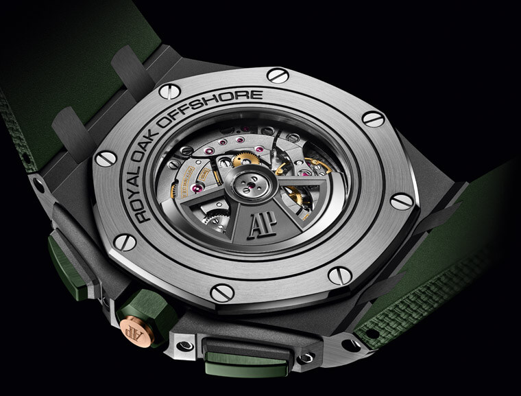 三款錶一如先前品牌推出的44mm皇家橡樹離岸型自動上鍊計時碼錶皆搭載3126/3840自動機芯,由透明底蓋可以看到局部鏤空且鍍黑的自動盤負責隨時替手錶補充動能,這枚由365枚零件組成,配備調校慣性的砝碼微調,動力儲存有50小時的水準。