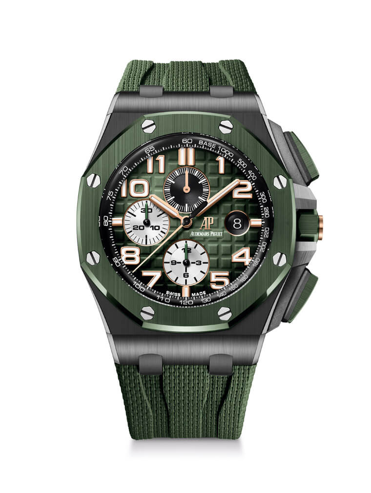 其中藍色和綠色款式分別在錶圈以及計時按把方面啟用同色的陶瓷材質來搭配藍面和綠面,至於它們的計時按把保護裝置則是用鈦金屬材質製成。而望向兩款的面盤可以注意到它們的Mega Tapisserie格紋面盤上出現了一些與舊款不同的變化,包括面盤外緣測速計內側的刻度被移除、時標從幾何造型改成阿拉伯數字為主(只有12點和6點方向的時標例外),此外3點方向的AP Logo中間原本塗有夜光物料,新款則是取消了這個設計。另外綠面和藍面的差別在於前者的時標與指針為玫瑰金材質,後者則是應用白金材質,所以看起來會有冷暖色的對比感。