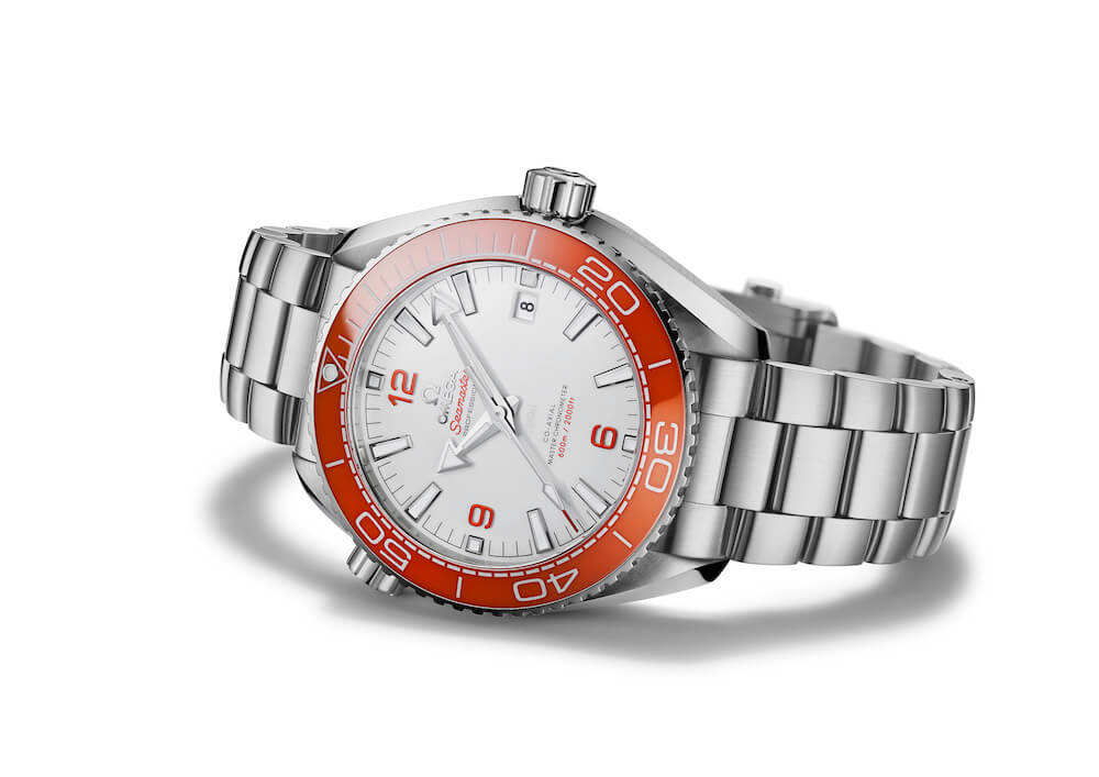 2019年歐米茄再次推出橘色錶圈的海馬Planet Ocean 600M,這次不同的是錶圈換上了陶瓷材質、面盤從標準黑色換成亮眼時尚的白陶瓷面盤,連機芯部分也更新成大師天文台認證機芯Cal.8900,特徵就是即使不用軟鐵內殼保護機芯,光是透過機芯內部的非鐵材質零件,就能有把握抗磁抗到15,000高斯以上的程度,一改潛水錶不透背習慣,讓錶主能夠隨時隨地欣賞機芯之美。