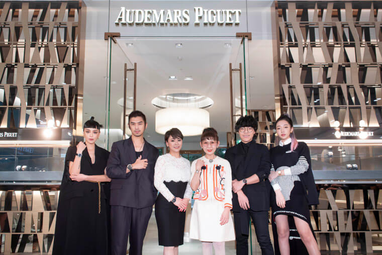▲遠東百貨信義A13愛彼A13概念店開幕記者會,左起為李函、陳柏霖、台灣愛彼總經理Jenny Lin、遠東百貨董事總經理徐雪芳、盧廣仲、吳卓源等嘉賓合影。