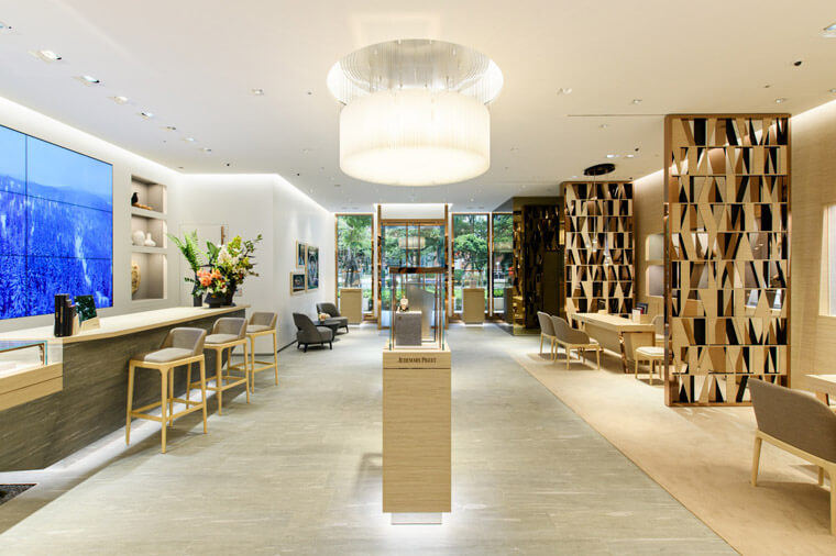 愛彼遠百信義A13概念店共有兩層樓,概念店的設計靈感源自愛彼發跡地——瑞士汝拉山谷(Vallée de Joux),例如傢俱與陳列擺飾便巧妙結合布拉蘇絲當地的原木與奇岩,店內更特別選用瑞士原廠木質香氛,創造專屬品牌的親切溫暖氛圍,讓來到店內的消費者彷彿置身自己家中般自在。概念店二樓特別規劃愛彼手錶的售後服務區,二樓同時也設置了獨立貴賓包廂,裝潢風格可見星空夜語,一走進去就讓人感到驚豔。