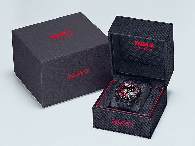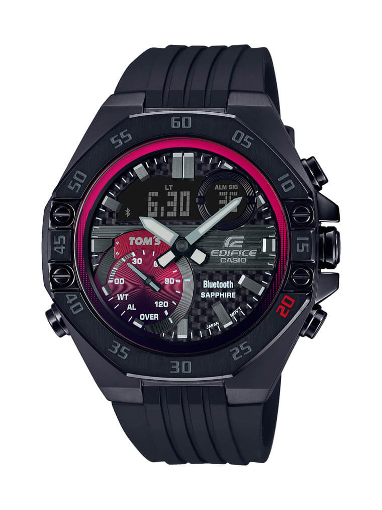 至於雙方這次聯名的ECB-10TMS是以ECB-10系列為基礎,不過新款的設計靈感是來自於TOM'S車隊的所在地——富士山,例如面盤左下角的紅黑漸層錶環與錶眼,就是品牌用來象徵富士山的日出景色,錶眼上還清楚印上TOM'S車隊的Logo。而為了突顯手錶與賽車界聯名的主題,它的整體設計也蘊含強烈的賽車基因,例如錶眼外側有點像是煞車碟盤、面盤材質也採用賽車界中常用的高科技碳纖維材質;另外卡西歐也針對車手的實際佩戴需求分別採用能防刮與提高閱讀清晰度的藍寶石水晶鏡面,並將錶帶末端家後以防止手錶在佩戴過程中滑落。