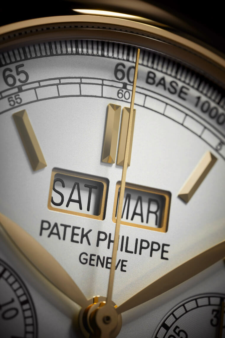 錶款的萬年曆功能主要仰賴小錶盤與視窗提供豐富資訊,包括六點位置的指針式日期顯示、十二點位置的星期及月份顯示窗,另外在面盤下緣兩側還各有一個展示日/夜和閏年週期的圓形視窗,處於兩個小圓視窗中間的則是傳統的扇形月相顯示。另外9點方向的小錶盤用來指示小秒、3點方向的小錶盤則是累積分鐘計算結果,搭配中央計時秒針,5270J-001的計時功能同樣簡潔易懂。