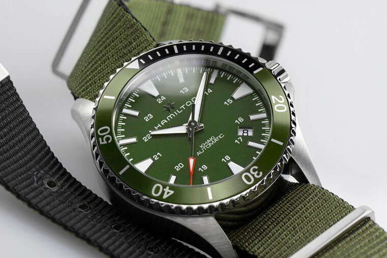 Khaki Navy Scuba系列源自於以Khaki Navy Frogman蛙人系列,不過比起後者的粗獷外型,Khaki Navy Scuba倒是顯得比較內斂低調些。漢米爾頓這次分別幫藍面和綠面新款搭配NATO和不鏽鋼鍊帶,共衍生出四種款式可選。