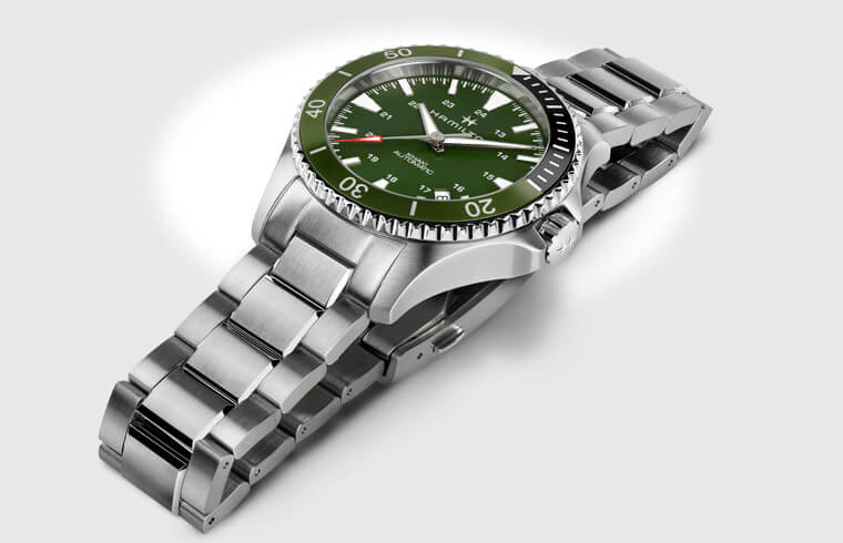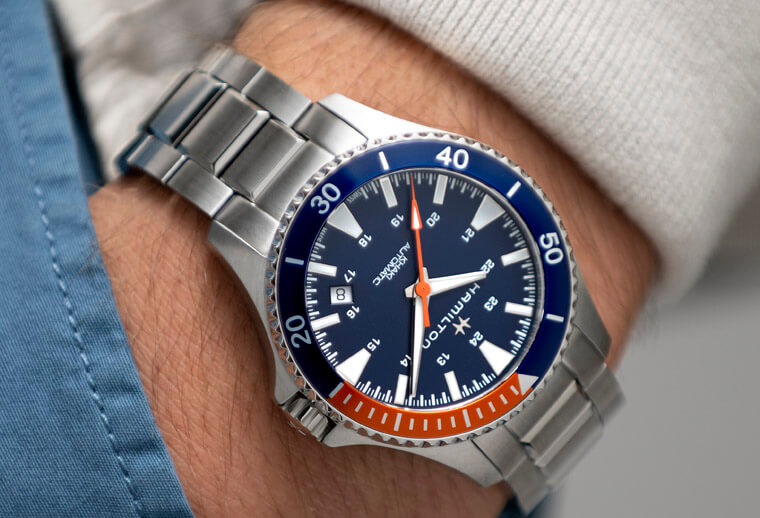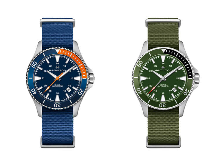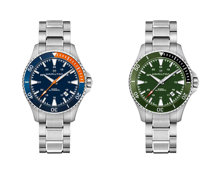 藍色面盤款式搭配的單向旋轉錶圈主要為藍色,但是12點~3點方向則換上呈現對比感的橘色下潛計時刻度(此外手錶的秒針也同樣採用橘色呼應錶圈刻度),而綠色面盤款式同為雙色錶圈設計,綠色錶圈的12點~3點方向改為黑色,不過這款的秒針沒有改成黑色,或許是有可能會造成判讀上的混淆,因此漢米爾頓僅在秒針針尖塗上紅色以供佩戴者區辨。