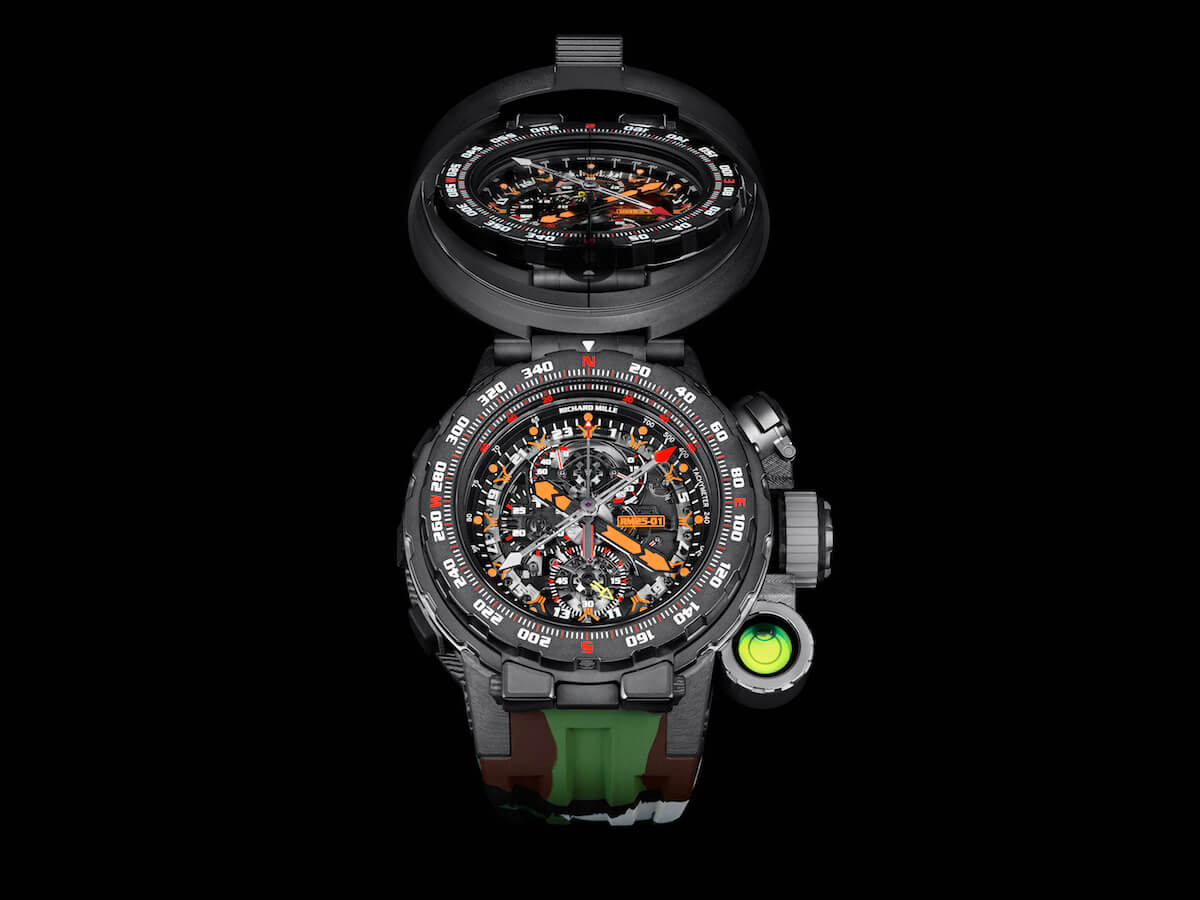 RM 25-01防水深度達100米,配有兩組可替換錶圈。第一組是經DLC塗層處理的五級鈦合金指南針錶圈,包含 一個固定錶圈及一個旋轉錶圈。錶圈配有卡口,可將其快速方便地固定在錶殼上。Carbon TPT®碳纖維材質 錶蓋裡面鑲有鏡面,並在12點鐘位置有一個小視窗,以利於指南針的瞄準。藍寶石水晶鏡面採用多層防眩 處理,並採用防磁塗層,避免機芯和指南針相互干擾。位於4點鐘位置的水平儀可檢查腕錶是否完全水平, 使測向更加準確。指南針亦可從錶上卸下,安裝在一塊Carbon TPT®碳纖維材質的底板上單獨使用。該底板 同樣提供了諸多實用功能,例如用來指示方向的刻線,非常適合配合地圖使用。