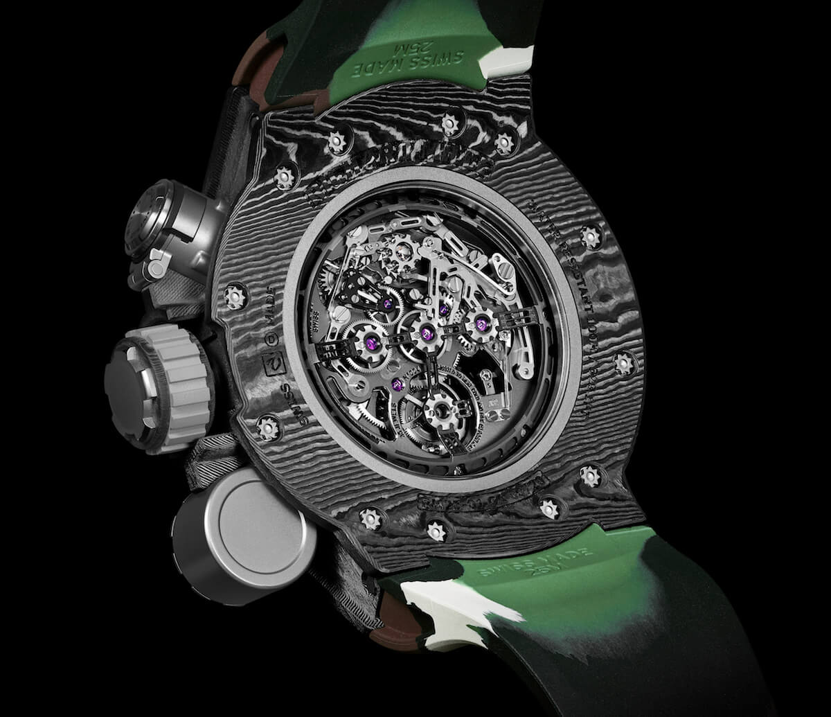 RM 025把複雜的計時碼錶加上了陀飛輪功能,防水提升到300米並且符合ISO6425潛水錶標準,輕量化鈦合金錶殼和奈米碳纖維機板讓實際佩戴更輕便,這聽起來容易不過卻是將機芯裡裡外外全都重新設計,大至錶殼設計銜接處理,小至螺絲、齒輪零件等重新打造,尤其是鈦合金導柱輪和槓桿零件減少慣性,大幅降低中軸的摩擦,確實提升精準度。所以RM 025所代表不只是一支功能潛水錶,而是象徵高端製錶技術一個偉大突破。