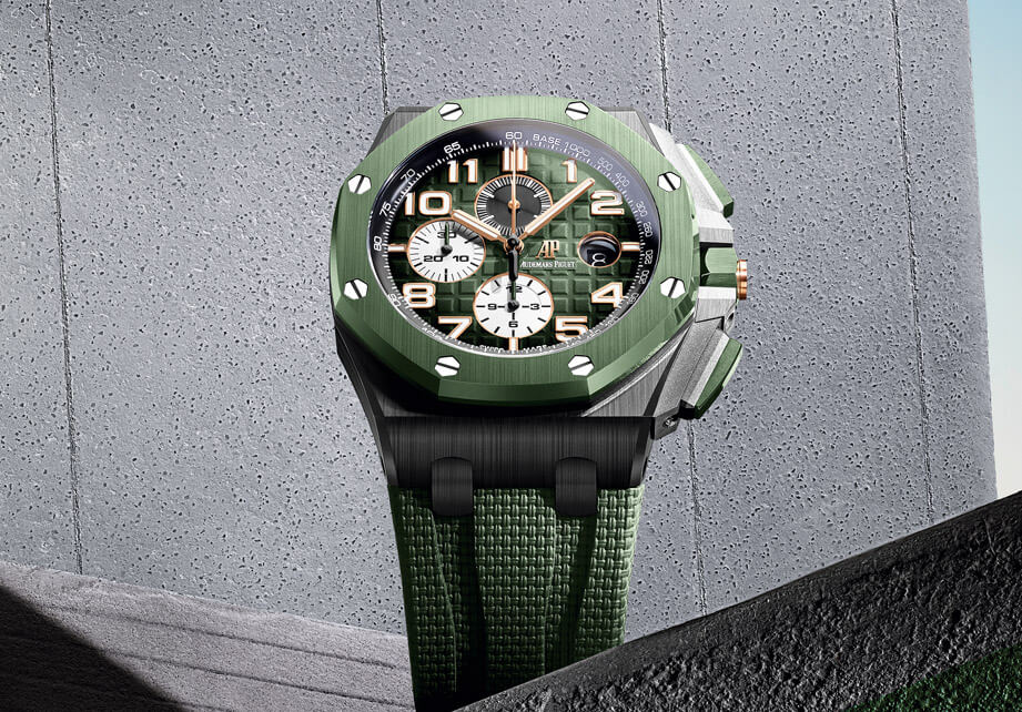 ▲2018年愛彼推出的皇家橡樹離岸型計時碼錶首見採用綠色這樣的異色陶瓷錶圈,自此品牌陸續開創出其他色調的陶瓷圈,跳脫傳統白色或黑色陶瓷框架。