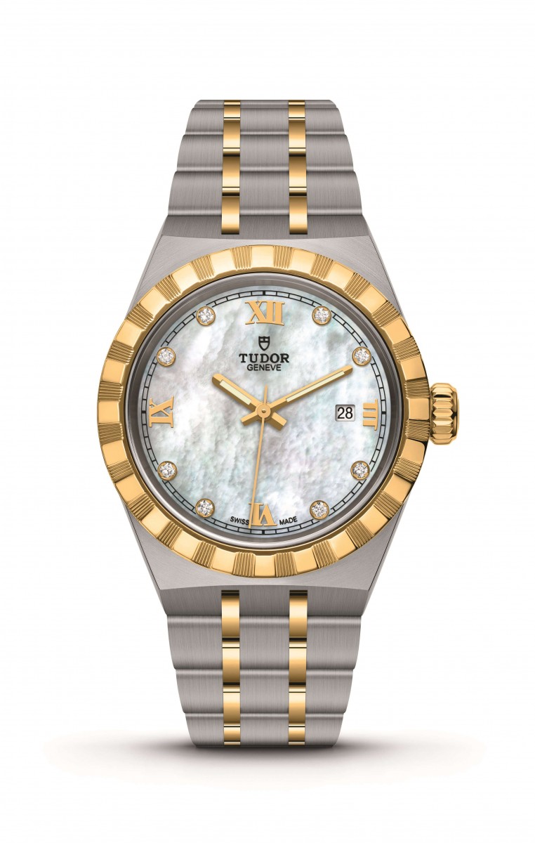 不鏽鋼、黃金材質/T201自動上鍊機芯/時、分、秒、日期顯示/珍珠母貝面盤/時標鑲鑽/藍寶石水晶鏡面/防水100米/錶徑28mm/參考價:NT$ 125,000