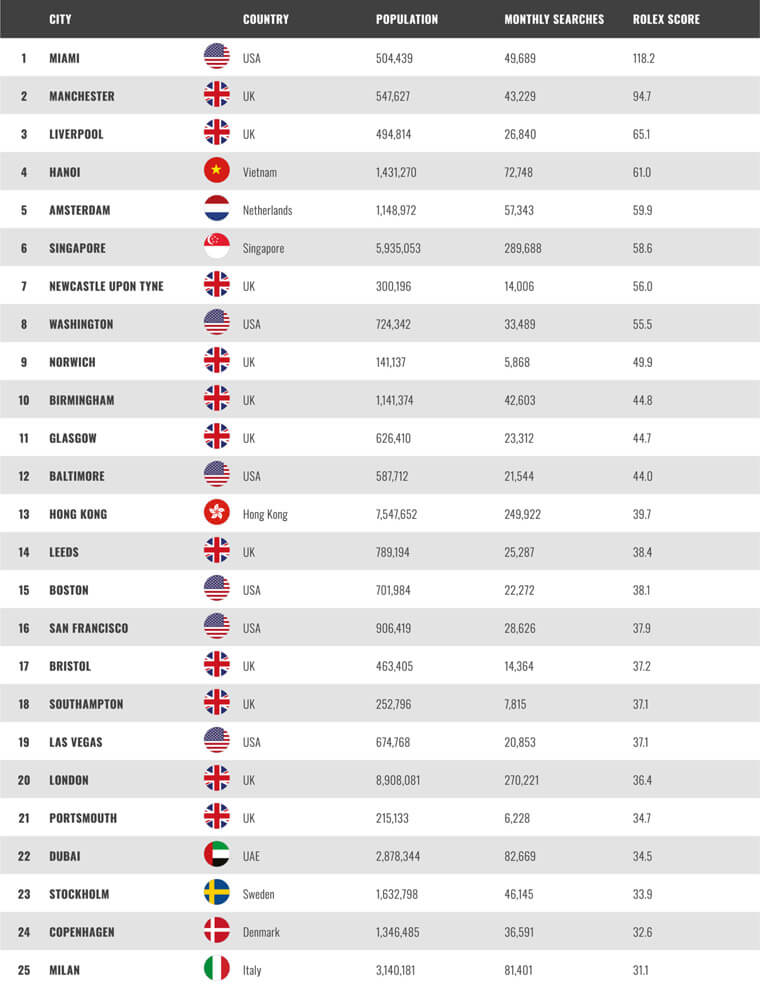 在英國有家高級二手錶商便針對全球網路搜尋”ROLEX”這個名詞的相關統計資料進行分析,從中可以找出全球最熱衷於查找勞力士關鍵字的城市排行。他們先挑出每年網路搜尋量在4000萬次以上的城市作為篩選基準,接著會用這些城市的人口數去除以他們每個月搜尋”ROLEX”的次數,如此一來可以得出一份搜尋”ROLEX”關鍵字密度最高的城市名單——換句話說這些城市也就是世上最熱衷於研究勞力士手錶的地方。