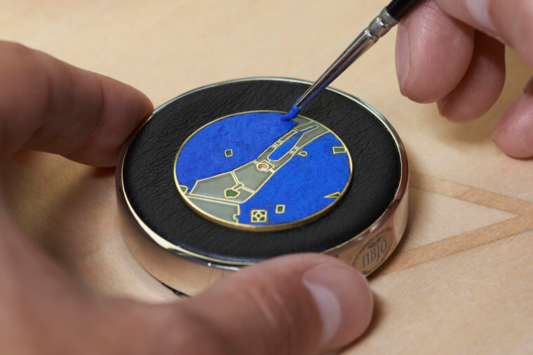 以上簡單介紹完藝術大師系列光之城的規格與機芯,接著要提到的是手錶的重點——面盤裝飾工藝。江詩丹頓以內填琺瑯勾勒出東京的夜景,品牌根據事先設定好的夜景輪廓,以手工挖出金質面盤相應部分,隨後填充多層半透明彩色琺瑯。每上一層琺瑯釉,面盤就要經過一次高達850°C的高溫燒製,通過烤製溶合的粉末狀玻璃與彩釉氧化物,再經冷卻便可玻璃化,但重點是這是一個反覆施作的過程,必須要確保琺瑯成品的色澤符合品牌期待且不出現裂痕才算完成。