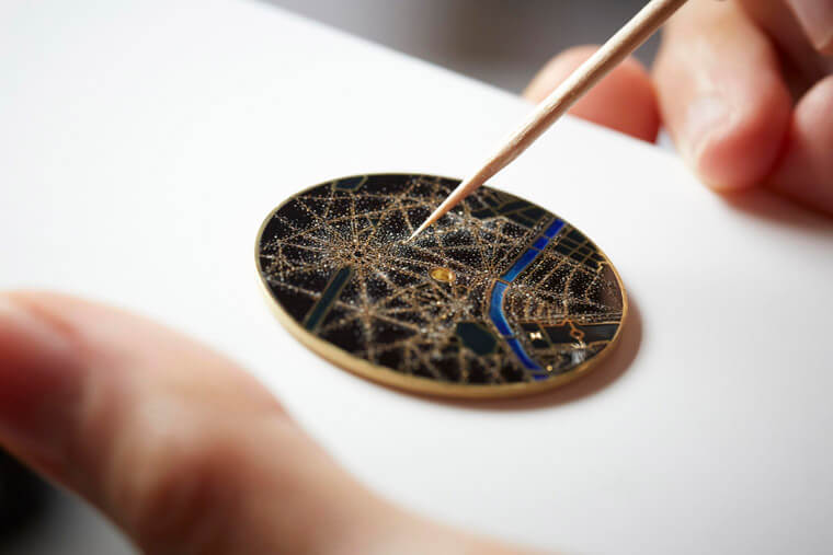 除了琺瑯之外,江詩丹頓另外邀請到日本知名藝術家今井陽子(Yoko Imai)施展手工點綴珍貴粉末來揣摩出城市夜晚的點點燈火畫面,藝術家採用金、珍珠、鉑金和鑽石粉末一一精細地點綴於琺瑯上,過程中會先以細小的金粉做背景裝飾,使面盤呈現璀璨光芒。隨後鑽石和鉑金粉末交替填充,打造出迷人的光影效果,最後再用珍珠亮片做點綴。只要調整其方向和尺寸,其所呈現的不同光澤,便可讓面盤呈現出有溫度的萬家燈火質感。