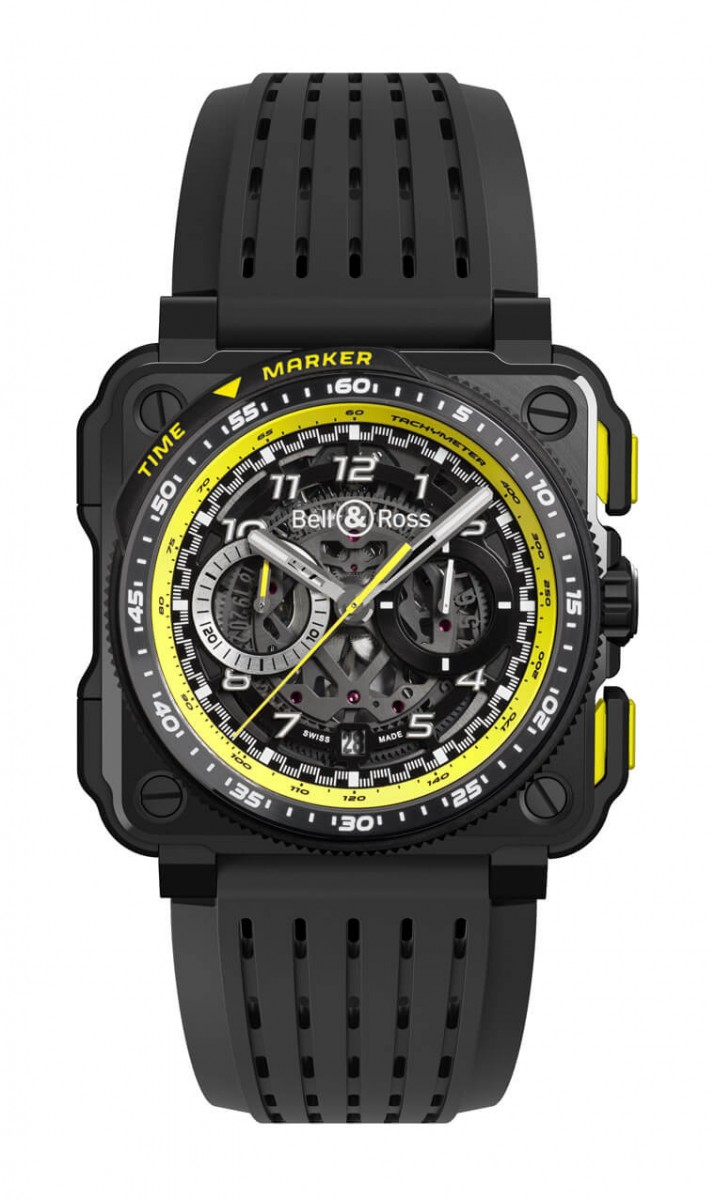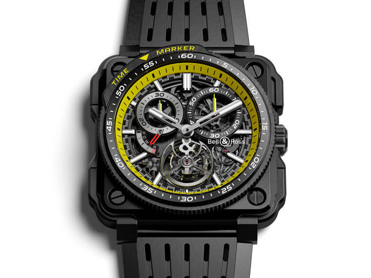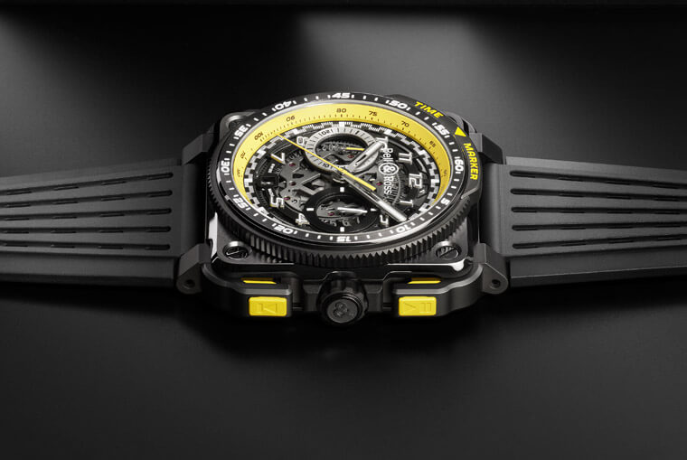 BR-X1 R.S.20採用品牌標誌性的外方內圓錶殼。這款經過傳統工藝打磨的鏤空計時碼錶僅限量推出250只,堪稱BR 03-94錶款之強化版。錶殼以多種材質混搭製成,包括PVD鍍層鈦金屬、陶瓷和橡膠。這些材質不僅用於製作運動錶,同時也是航空及Formula 1®賽車領域的常用材質。錶款右側的搖杆計時按把讓人想起方向盤上的換擋撥片。而透過開面面盤還可看到計時機芯複雜的輪系結構,另外面盤外緣的分鐘軌道刻度被分割成一個個小型的黑白方格,象徵賽車場上終點線位置所使用的黑白方格旗,搭配醒目的黃色計時指針,看起來相當清楚。