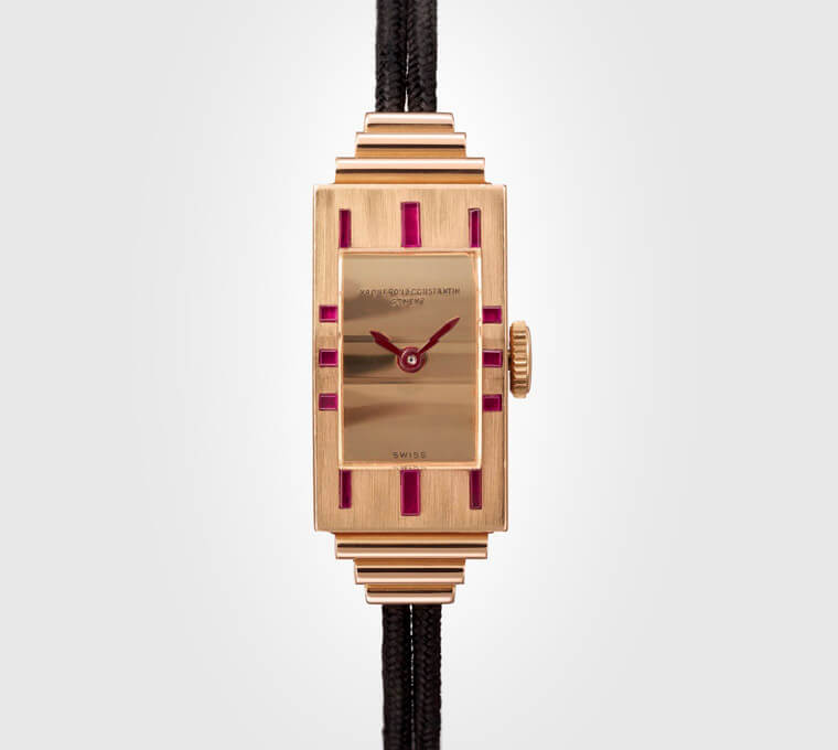 20世紀初在裝飾藝術(Art Deco)盛行的時代,錶殼不再只局限於經典的圓形,它們以橢圓形、長方形或方形等出現,江詩丹頓藉著這一流行趨勢,打造出名副其實的非圓形錶款。透過這款鉑金及黃金錶體現得淋漓盡致:其錶圈和轉軸式錶耳上鑲嵌美鑽,而八邊形的錶殼側邊刻有花紋,錶底還飾有Guilloche機刻圖案,看起來顯得華麗非凡。