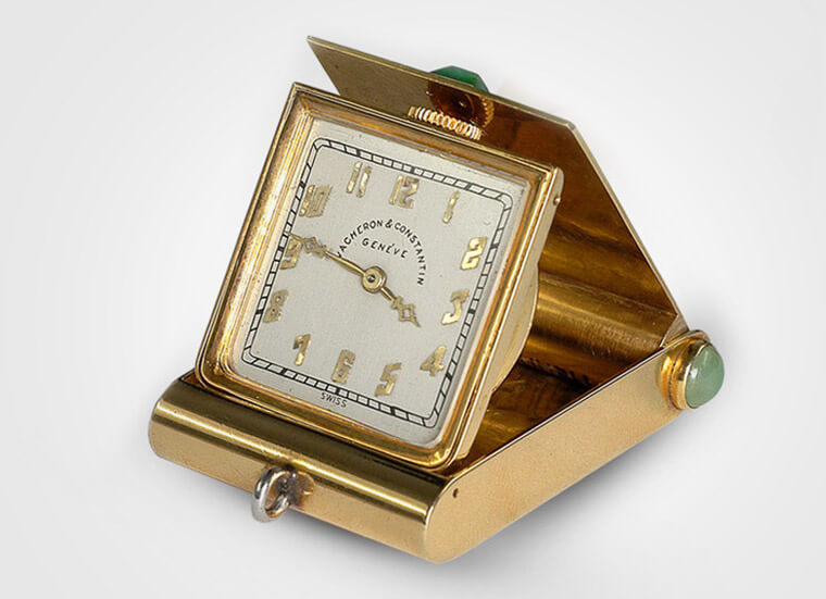 在咆哮的二○年代中,旅行錶成為人們經常佩戴的物件,江詩丹頓這款黃金女錶便裝飾有凸面型翡翠和內填琺瑯幾何圖案。