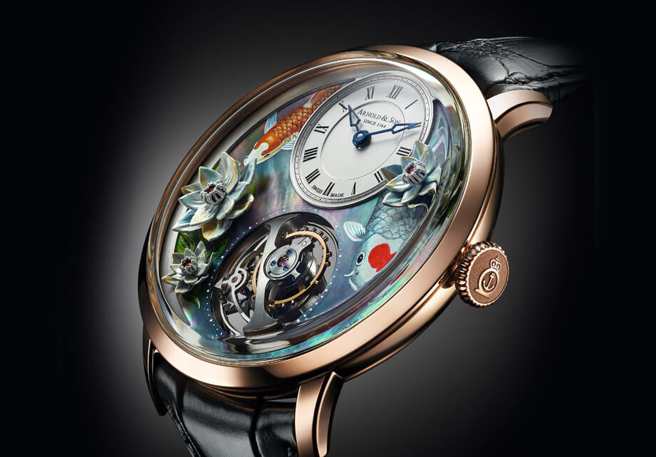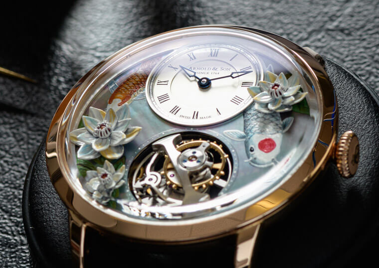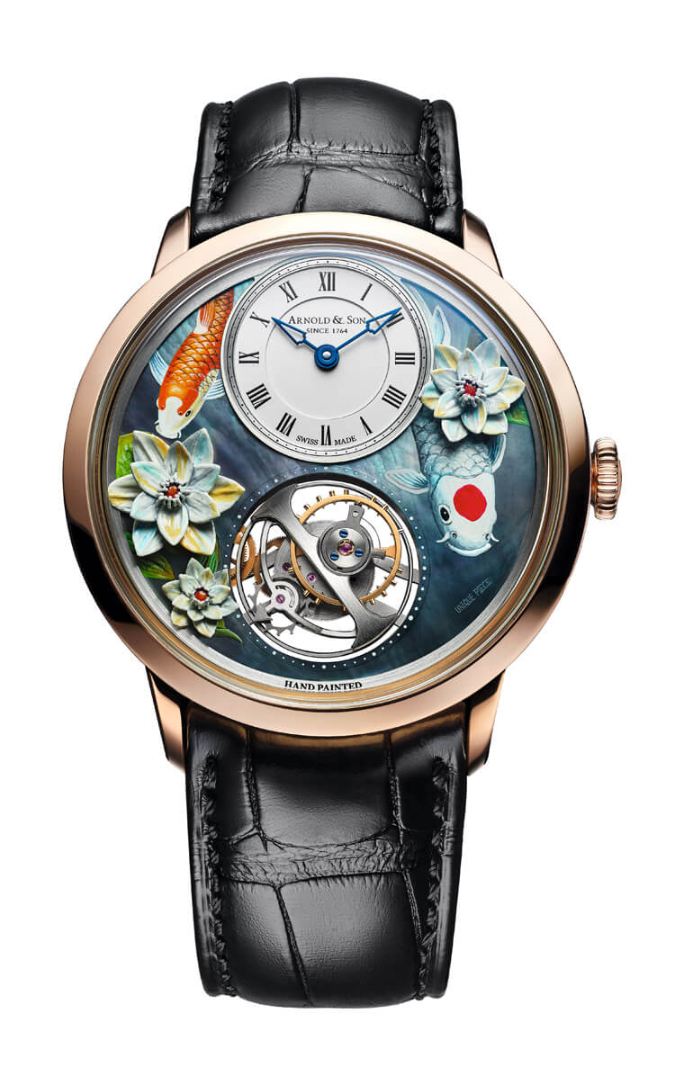 ARNOLD & SON亞諾表有深厚的傳統製錶技藝,所以他們家的手錶有時呈現出偏向古典的一面,有時則是從傳統中蛻變出現代科技的樣貌。品牌最近推出的新作超薄陀飛輪錦鯉限量款就是比較具有古典風格的一款,而且這次品牌並非純以密致的機械結構樣貌吸引人,他們還融入了少見裝飾工藝,賦予手錶一股濃濃的人文工藝色彩,從錶款定價超過300萬台幣並且僅限量1只的珍貴程度來看,它的製作難度可見一斑。