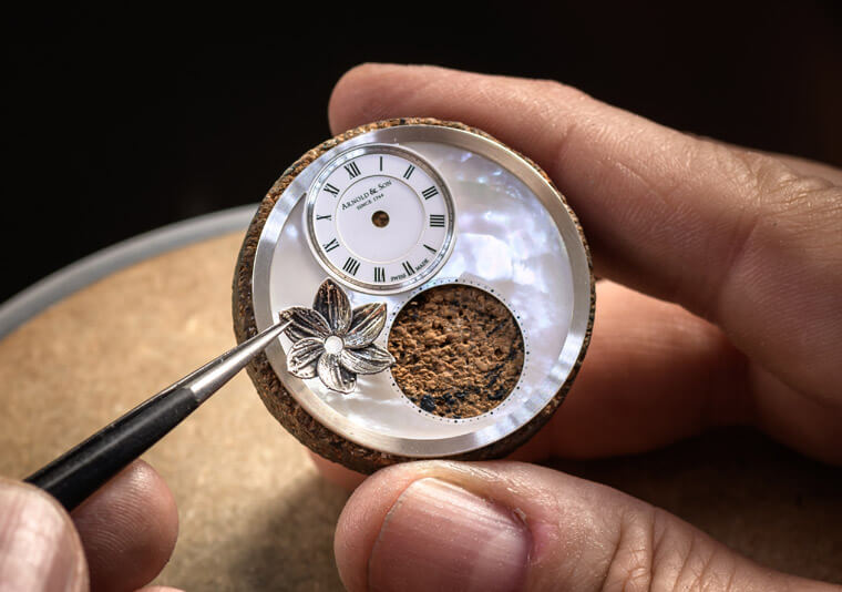 ▲製錶師在珍珠母貝面盤上,將銀製蓮花一朵一朵刻劃而成並鑲嵌固定於面盤上。