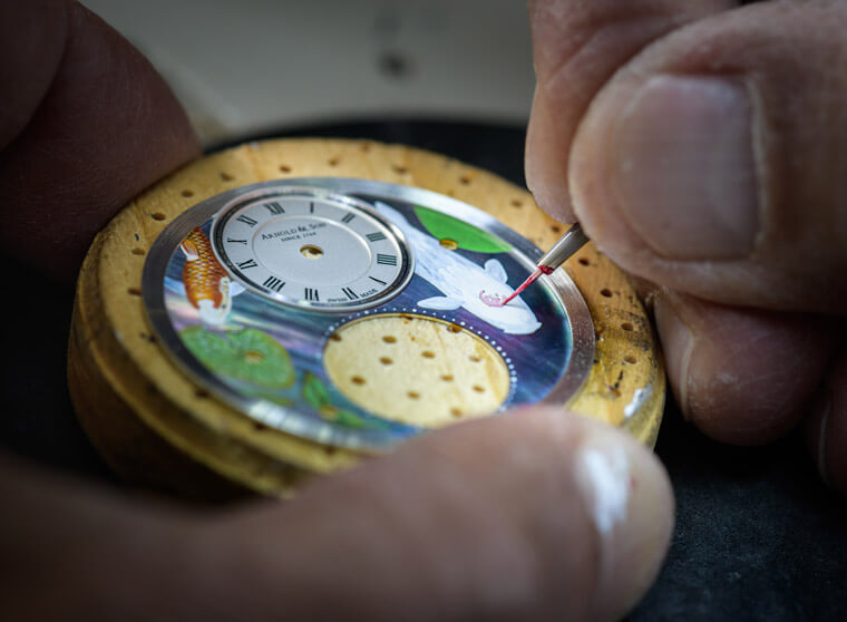 ▲製錶師運用微繪技法為錦鯉上色,每個鱗片乃至條紋細節呈現出栩栩如生之姿。